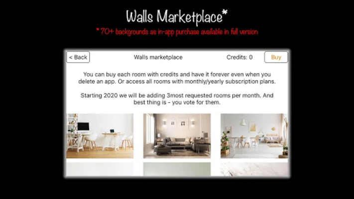 Whole app is free with all functions and 12 default stylish interiors for small, round and big formats. Only thing you need to pay is need for more walls. You can decide if you buy credits and then select which walls do you download and have them for lifetime. Or you can pay monthly/yearly subscription and you will have access to all walls till you pay it.